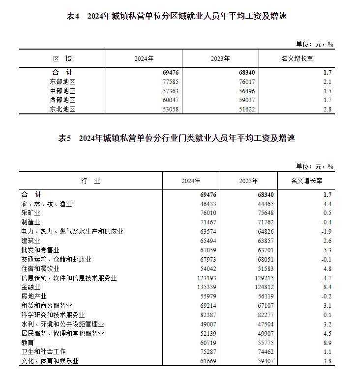 2024年,全国城镇私营单位就业人员年平均工资69476元,名义增长1.7%,实际增长4.0%。这一增长趋势显示了私营部门在薪资方面的稳步提升。