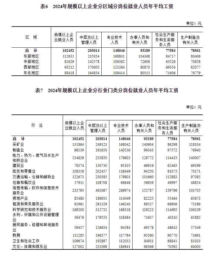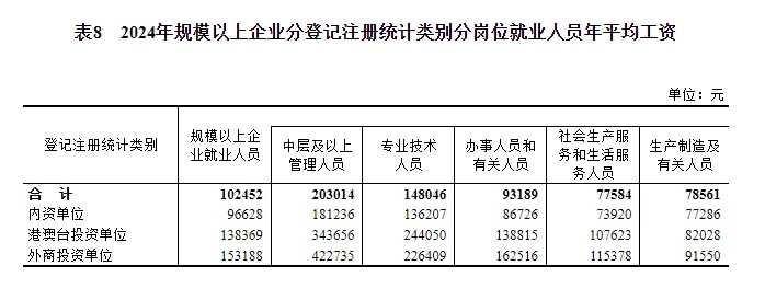 2024年,规模以上企业就业人员年平均工资为102452元,名义增长4.4%,实际增长4.2%。各类人员薪资均有不同幅度增长,体现了经济发展的积极成果。
