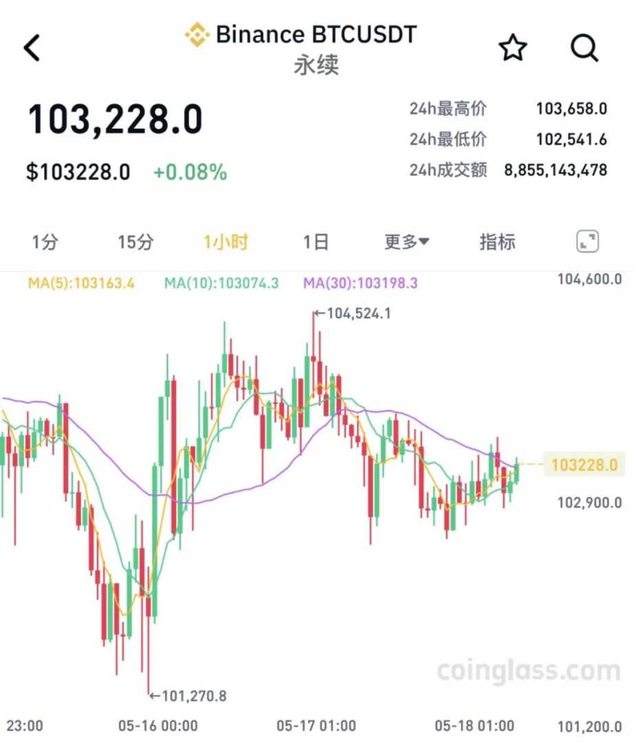 中国基金报记者李智报道,比特币价格在突破10万美元后,维持高位震荡。5月18日早间,比特币一度跌破10.3万美元,但随后迅速回升。