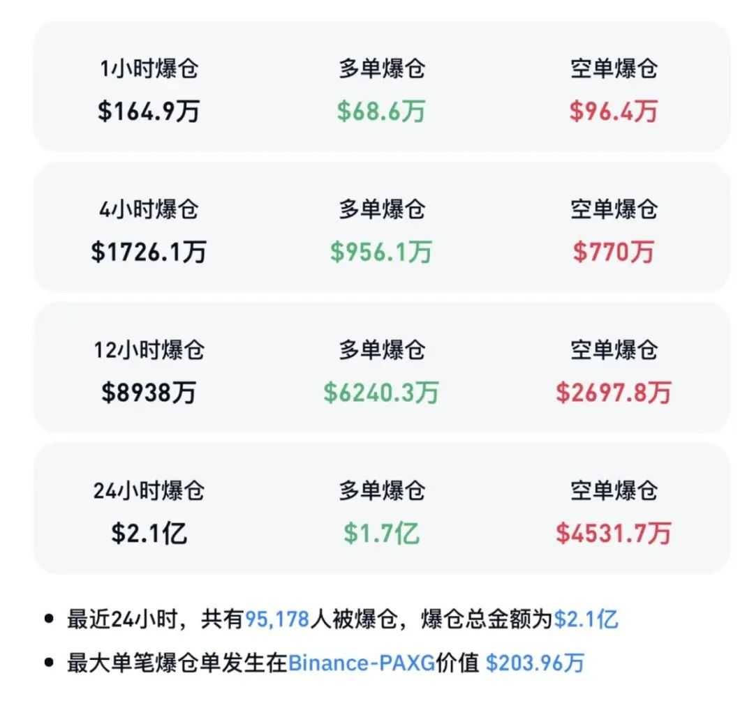 据央视新闻报道,全球三大评级机构之一的穆迪,将美国主权信用评级下调至Aa1,导致加密货币等风险资产短时下跌,以太坊、币安币等纷纷走低。受此影响,Coinglass数据显示,过去24小时加密货币市场共有9.5万人被爆仓,总金额高达2.1亿美元。