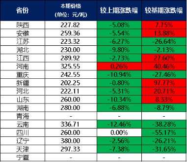分价格区间来看,单价300元/吨及以上的地区有河南、云南、辽宁;300元以下的有陕西、安徽等12个地区。这些价格区间显示了市场的差异化。