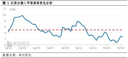 2025年1-4月中旬,国内主营炼厂开工负荷较低,叠加海外调油需求尚可,国内二甲苯供应偏紧。以江苏主港为例,1-4月份二甲苯到货量及库存均较低,整体库存呈下降趋势。总供应偏紧支撑市场价格,尽管OPEC增产、中美关税等拖累国际油价,二甲苯跌幅仍低于下游PX等产品。
