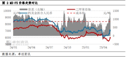 宏观消息面向好,MX-PX价差拉大,PX企业集中采购推动二甲苯市场持续上涨。经历持续下跌后,二甲苯及相关产品抗跌性增强。中美关税商谈结果超预期,市场看涨情绪提升。下游聚酯开工负荷提升,MX-PX价差拉大,短流程生产盈利,二甲苯成交量激增,市场活跃度提升。