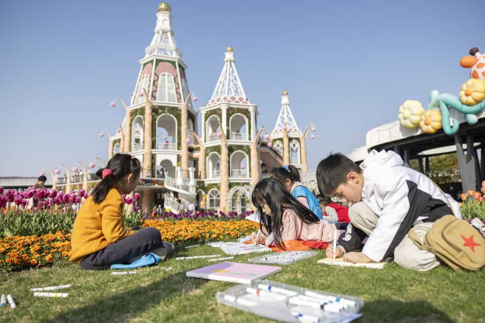3月22日,在上海浦江郊野公园奇迹花园草坪上,小朋友们正绘制着鲜花,这是城市更新带来的美好生活的一角。新华社记者王翔摄