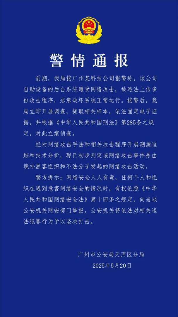 广东省广州市公安局天河区分局发布通报,广州某科技公司自助设备后台系统遭受网络攻击,被上传多份恶意代码。公安机关迅速介入,提取样本,固定证据,初步判定为境外黑客组织所为。