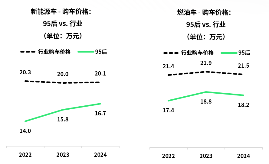 当前,新能源车市场购车价格连续三年保持稳定,而“95后”人群的购车价格虽低于市场均值,但逐年攀升。相较于燃油车市场,“95后”在新能源领域的消费影响力更为显著。他们消费行为理性,注重成本效益,更看重产品是否符合自身生活方式和身份表达,这种价值主张正在重塑车企的产品研发与品牌传播策略。