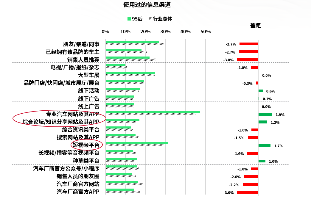 “95后”更信赖短视频与“网友口碑”,线上“种草”逐渐取代熟人推荐。他们对官方品牌渠道的热情较低,更倾向于通过社交平台与短视频平台获取信息。这种渠道偏好与内容需求的变化,促使汽车厂商调整营销策略,将“去权威化”和“社交化体验”作为核心。
