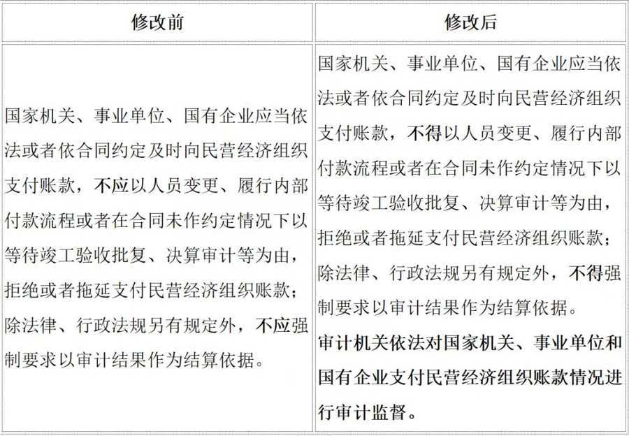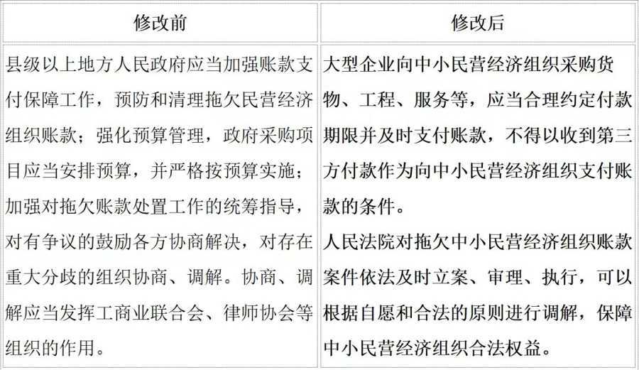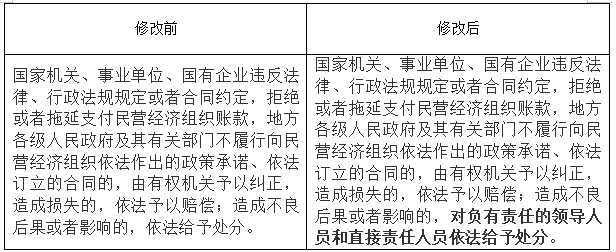 第四条建议是明确无故拖欠民营企业款项的责任追究主体,增加条款执行性和敦促效果。采纳后,《民营经济促进法》第七十三条增加了对负有责任的领导人员和直接责任人员的处分规定。