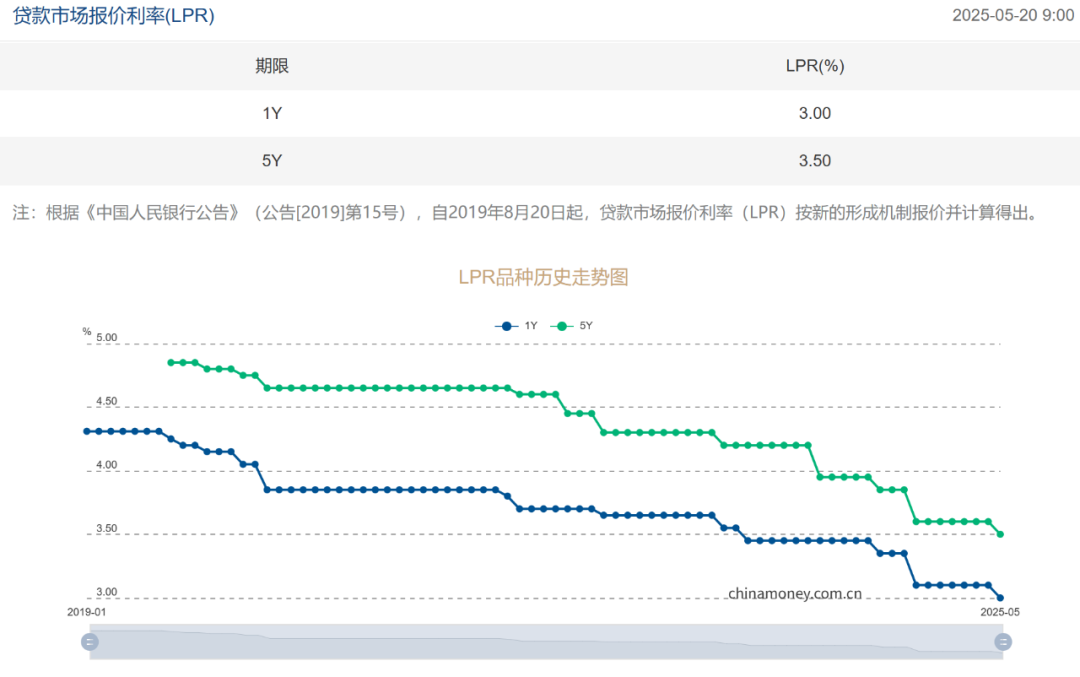 5月20日,新一期贷款市场报价利率(LPR)公布:1年期和5年期以上LPR均下调10个基点,其中1年期LPR降至3%,5年期以上LPR降至3.5%。这是LPR年内首次下调,预计将显著降低企业、居民的融资成本,进一步提振市场信心,为实体经济稳定增长提供有力支持。