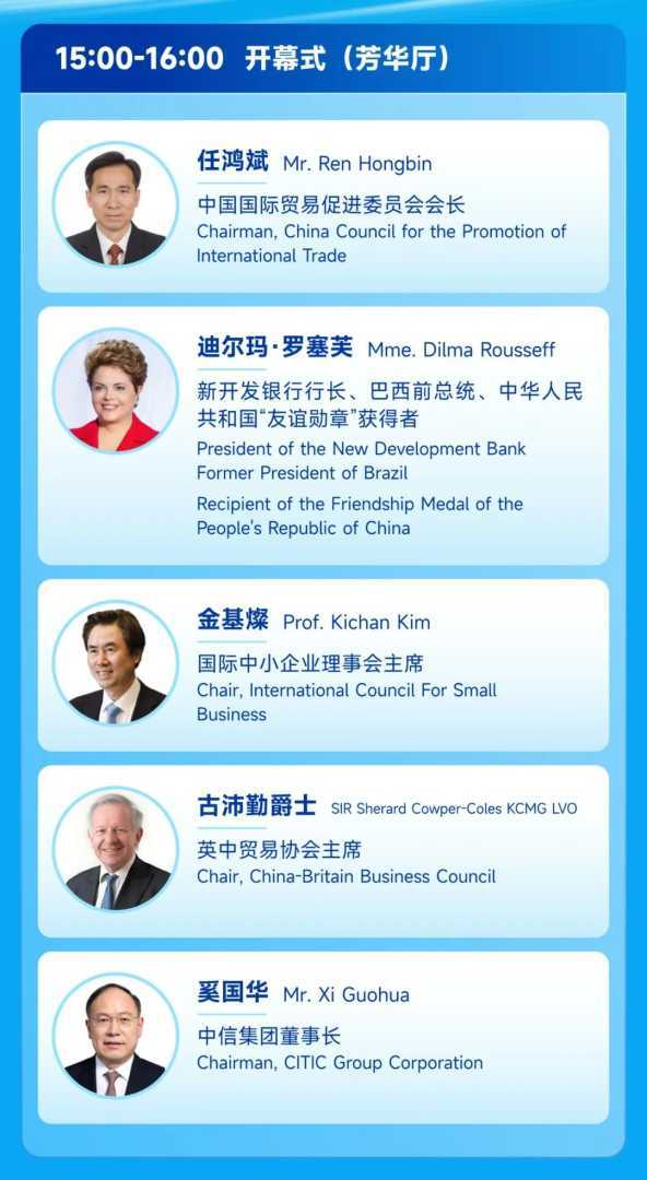 据中国贸促会发布的预告显示,此次峰会吸引了众多重量级嘉宾出席,包括中国贸促会会长任鸿斌,中信集团董事长奚国华,新开发银行行长、巴西前总统、中华人民共和国“友谊勋章”获得者迪尔玛·罗塞芙,国际中小企业理事会主席金基燦,英中贸易协会主席古沛勤,中国美国商会会长何迈可,中国丹麦商会全国创始会长李曦萌等,共襄盛举。