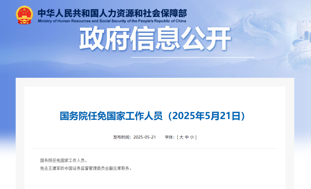 国务院免去王建军的中国证监会副主席职务,这一人事变动于5月21日正式公布。国务院任免国家工作人员名单中,明确免去王建军的中国证券监督管理委员会副主席职务。