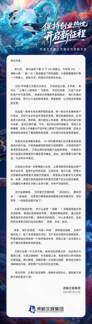 阿里大文娱迎来了重大变革。5月21日,阿里大文娱集团正式更名为虎鲸文娱集团,旗下阿里影业也将更名为大麦娱乐。这一变化与淘宝商城更名为天猫的转折相呼应,虎鲸文娱集团以全新的姿态,开启一段崭新的征程。持续为用户提供精品内容、不断优化服务体验,借助AI为行业带来更良性发展的初心与业务战略,始终未变。