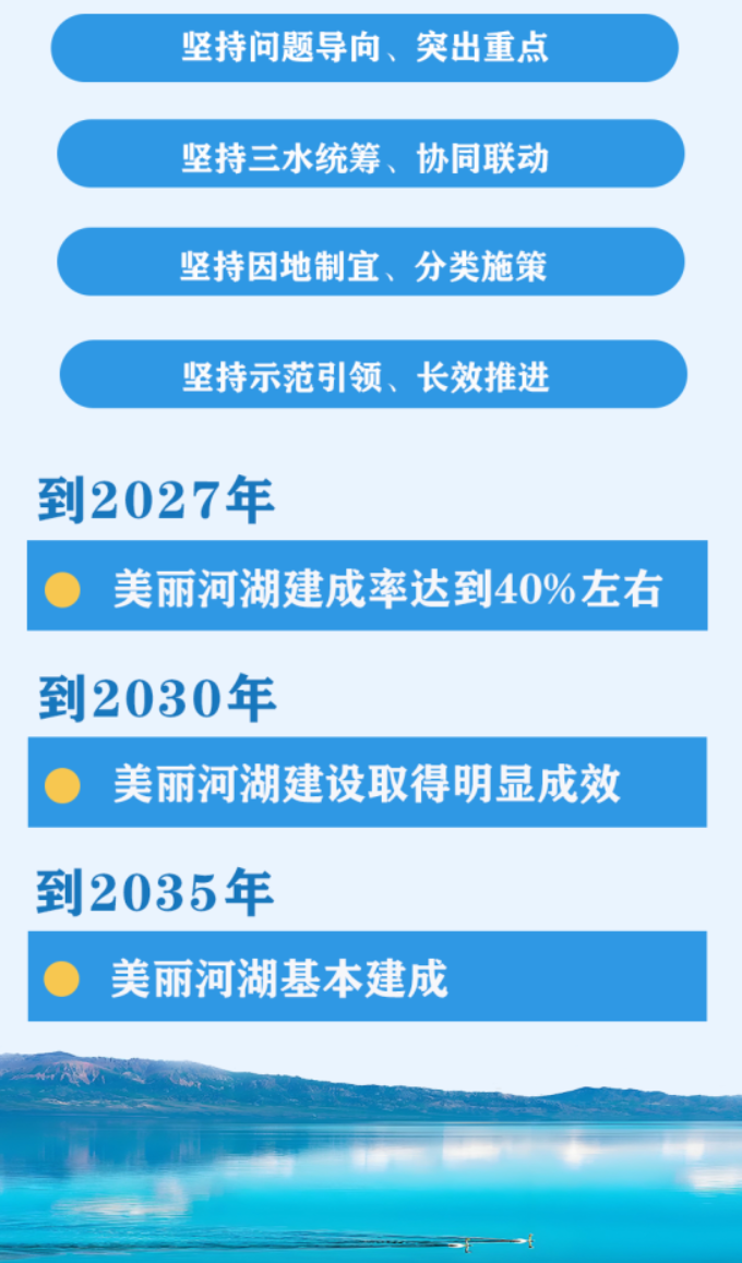 《行动方案》明确,以改善水生态环境质量为核心,坚持精准治污、科学治污、依法治污,统筹水资源、水环境、水生态治理。计划到2027年,美丽河湖建成率达到40%左右,逐步构建起上下游贯通一体的生态环境治理体系。