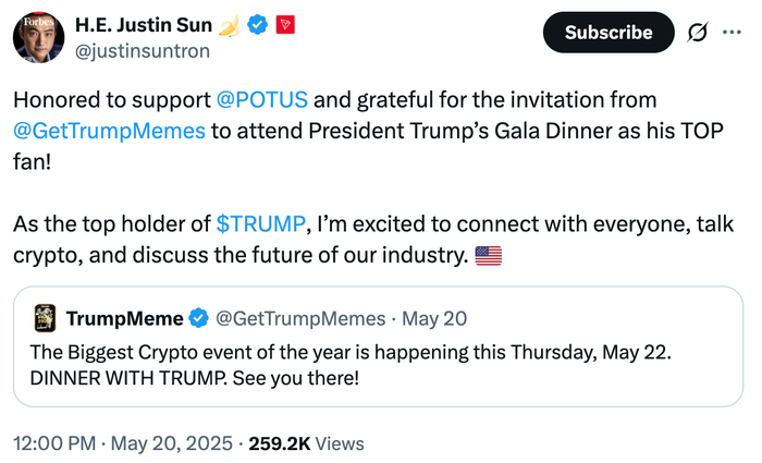 波场(TRON)区块链创始人孙宇晨当地时间5月20日在社交媒体平台X发文称,他成为了美国总统特朗普的迷因币“特朗普币”的“最大持有者”,并将出席22日在特朗普私人俱乐部举行的晚宴。此次晚宴备受瞩目,因为“特朗普币”官方账号上月已宣布,将于5月22日在华盛顿特区的特朗普私人俱乐部邀请持币量前220名的持有者共进晚餐,这些幸运儿将有机会“近距离聆听特朗普畅谈加密货币的未来”。此外,持币量前25名的投资者还将受到特别邀请,参加特朗普独家招待会及“特别版”VIP之旅,这无疑为加密货币领域增添了新的看点。