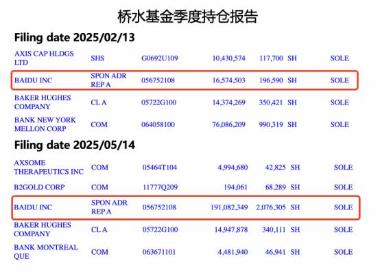 桥水基金一季度10倍增持百度