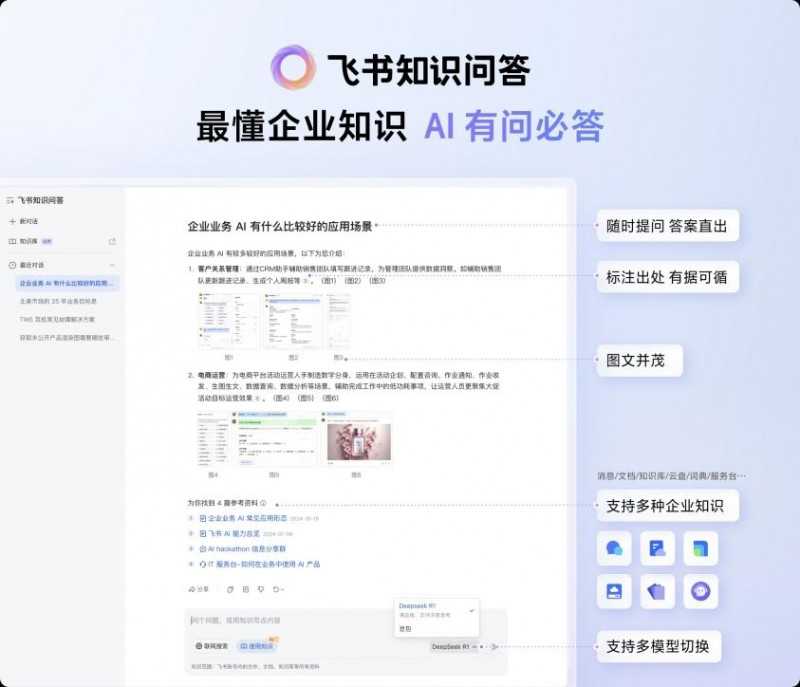 飞书发布基于企业知识的专属AI问答工具,提供B端场景AI价值。用户可随时提问,系统根据权限访问信息给出答案。支持调用豆包及DeepSeek大模型,提升问答交互精准度和效率。