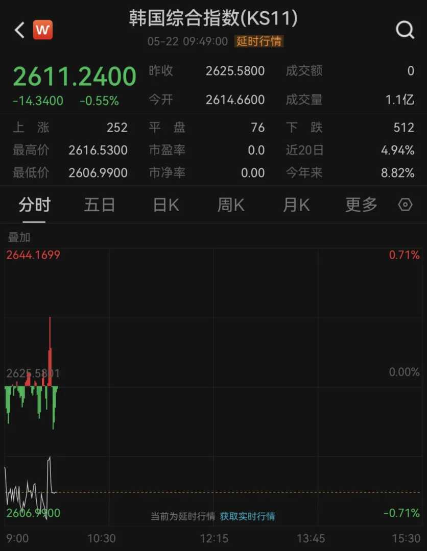 比特币再次刷新历史新高。5月22日,亚太市场普遍下跌,日经225指数一度跌超1%,截至发稿,日经225指数跌0.67%,韩国综合指数跌0.55%,富时新加坡海峡指数跌0.27%,澳洲标普200指数跌0.30%。A股市场开盘涨跌不一,沪指低开0.17%,深成指低开0.19%,创业板指小幅高开。香港恒生指数开盘跌0.33%,恒生科技指数跌0.11%。