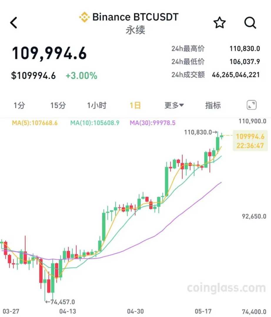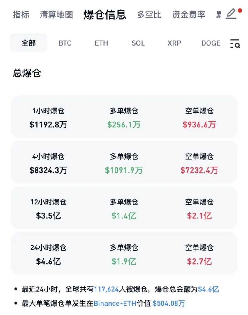 国际金价小幅走强,伦敦金现和COMEX黄金均有所上涨。比特币持续拉升,盘中突破11万美元,截至发稿,比特币报109994.6美元,24小时内上涨3%。除了比特币,以太坊和狗狗币等其他虚拟货币亦大涨。据Coinglass统计,过去近24小时内,加密货币全网爆仓人数近12万人,爆仓金额达到4.6亿美元。其中,最大单笔爆仓单发生在Binance-ETH,价值504.08万美元。