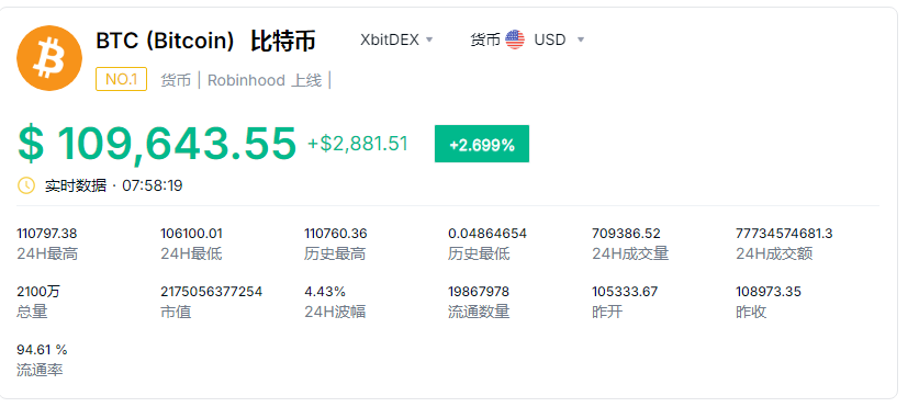 5月22日,比特币价格一度突破11万美元,再创历史新高,日内涨幅达2.699%。