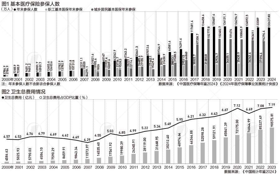 过去20多年间,我国医疗保险参保人数增加到13.3亿,基本实现全民覆盖。但发展中仍面临参保未完全覆盖、参保质量有待提升等问题。报告建议优化参保结构,探索动态筹资机制,扩大筹资来源,构建更加完善的医疗保障体系。