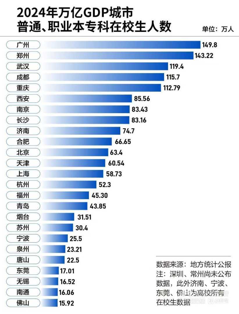 2024年,我国各大城市的高等教育数据陆续揭晓。根据各地发布的2024年统计公报,27个万亿GDP城市中,25个城市公布了高等教育相关数据,其中广州、郑州、武汉、成都、重庆五个城市的普通(职业)本专科在校生数量超过110万人,领跑全国。