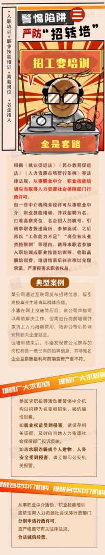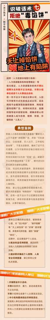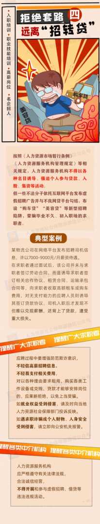 为加强风险防范,人力资源社会保障部、中央网信办、教育部已联合发布招聘欺诈典型案例,揭示不法分子的惯用手法和话术套路,旨在帮助高校毕业生等广大求职者提高风险识别意识,增强自我保护能力。