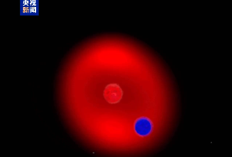 共包层演化模拟图,蓝色天体为中子星,红色天体为膨胀的巨星。(图片来源:央视新闻视频截图)