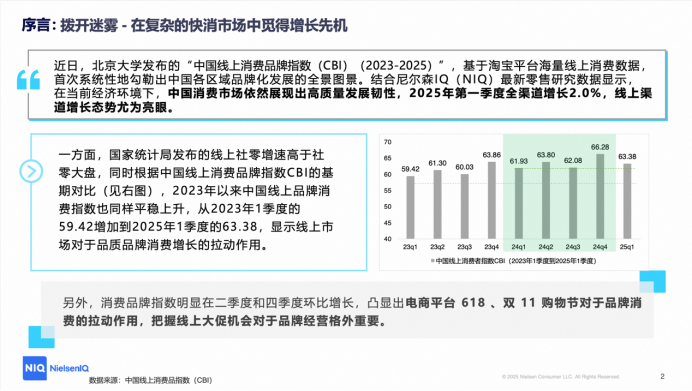 尼尔森IQ联合北大发布《洞察中国线上增长新引擎》,指出中国消费市场展现强劲韧性。报告揭示中国线上消费品牌指数增长,消费品质显著回暖。电商平台在推动品牌化消费中起关键作用,品质和创新是线上消费增长核心动力。