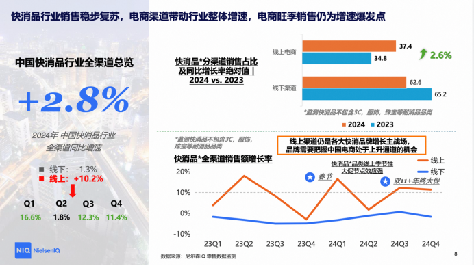 尼尔森IQ表示,电商平台在推动品牌化消费中起关键作用,电商旺季销售是增速爆发点。中国线上消费品牌指数在二季度和四季度环比显著增长,凸显618、双11购物节对品牌消费的拉动作用。