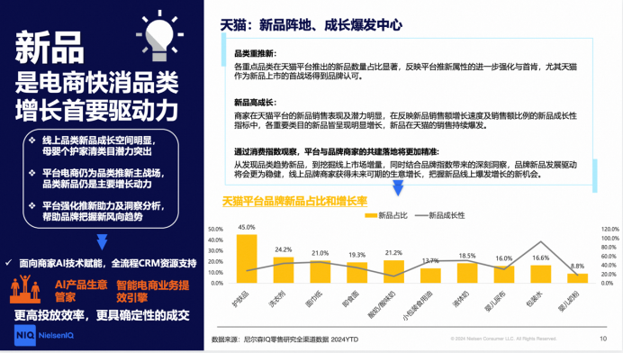 报告还显示,新品是电商快消品类增长的首要驱动力,天猫平台尤为显著。新品在电商快消品类中占比和增长率均突出。2024年,天猫平台新品展现出强劲增长潜力。