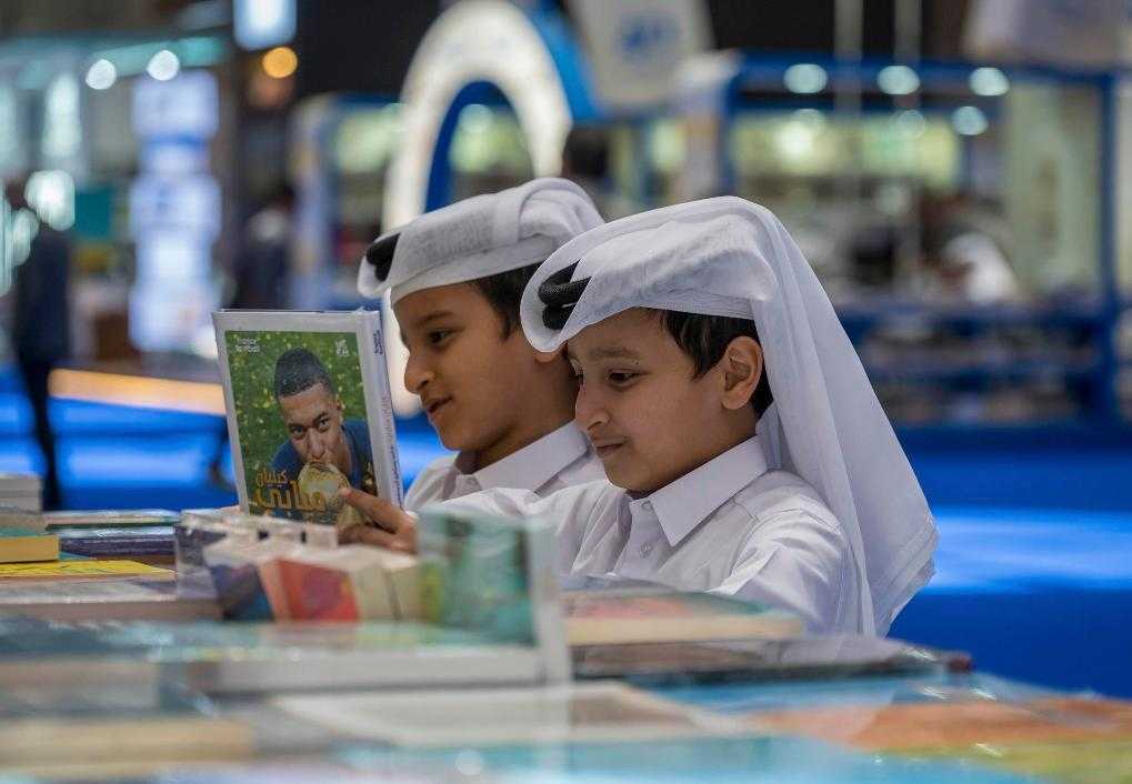 5月8日,两名小读者在卡塔尔多哈书展上挑选图书。新华社发(尼库摄)