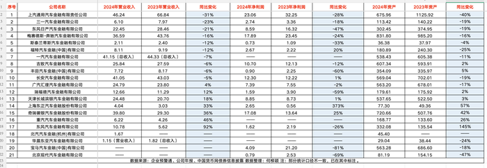 在25家持牌汽车金融机构中,剔除掉部分财务数据未有披露、已进入破产程序(华泰汽车金融)、数据未经审计(比亚迪汽车金融)的4家公司,界面新闻记者梳理了21家汽车金融公司的2024年经营数据。
