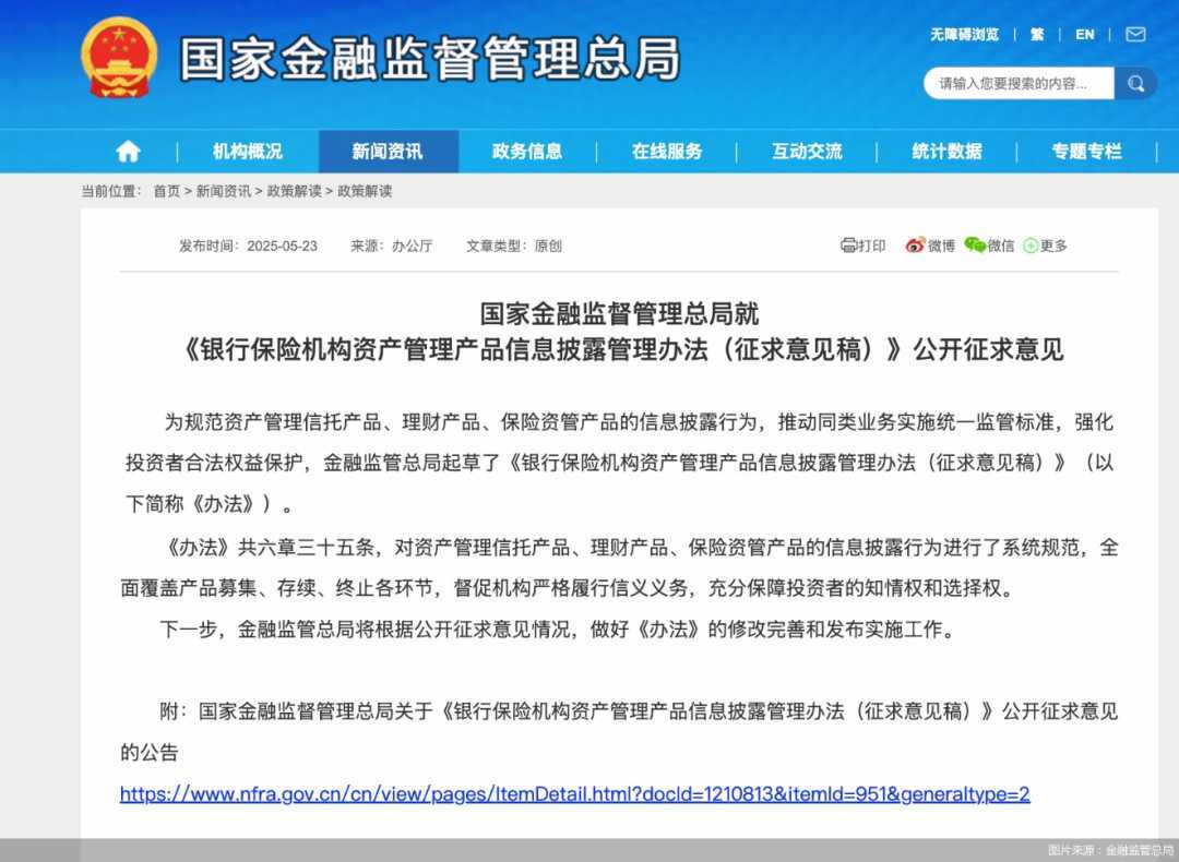金融监管总局发布《银行保险机构资产管理产品信息披露管理办法(征求意见稿)》,旨在引导行业将信息披露融入业务全过程,实现产品情况“三清”,提升市场透明度,保护投资者权益。