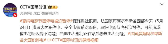 5月24日,法国滨海阿尔卑斯省西部遭遇大面积停电,戛纳电影节被迫暂停。电影节期间,多部中国影片登上大银幕,中国电影联合展台也亮相戛纳,向国际市场推介优秀电影作品,展现了中国电影的魅力。