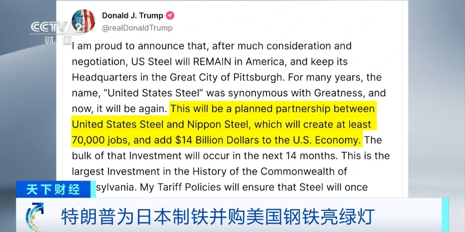 美国总统特朗普23日宣布,美国钢铁公司和日本制铁公司将携手建立“计划中的伙伴关系”,日本制铁公司将大手笔投资美国钢铁公司。这一消息极大地提振了市场信心,当天美国钢铁公司的股价飙升。