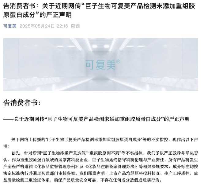 成分标注合规性存疑。根据国家药监局规定,含量超过0.1%的成分需按降序排列。可复美产品将“可溶性胶原”列为第七位,未明确标注为“重组胶原蛋白”。郝宇质疑其误导消费者,巨子生物回应称符合法规。