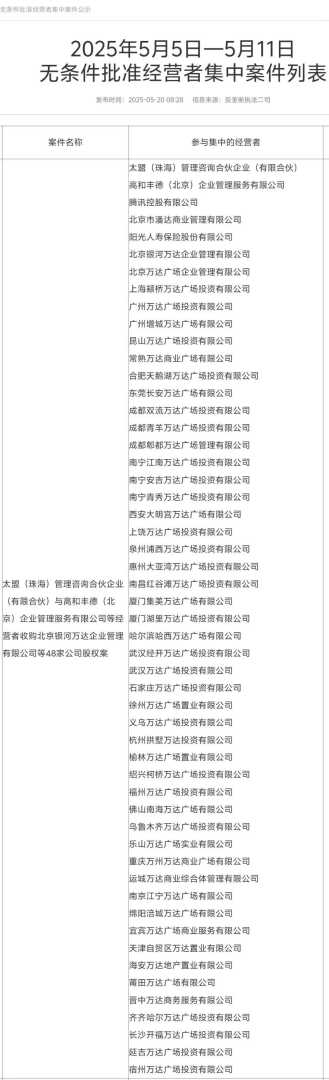 5月26日上午,“王健林再卖48座万达广场”话题冲上微博热搜榜首。据国家市场监管总局近日披露,太盟(珠海)管理咨询合伙企业、高和丰德(北京)企业管理、腾讯控股、北京市潘达商业管理、阳光人寿保险等共同设立合营企业,收购大连万达商业管理集团直接或间接持有的48家万达广场100%股权。
