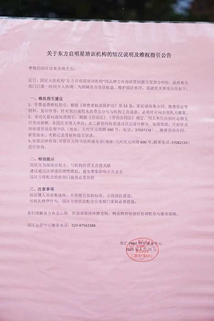 5月15日,东方启明星北京总部张贴公告称因“运营调整和设施维护”临时封闭,员工转为居家办公,但未明确恢复时间。随后,广州、武汉、青岛等地校区也相继停课。家长们纷纷前往校区维权,却发现大门紧闭,人去楼空。