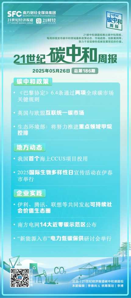 本期碳中和周报关注全球碳市场规则明确、英国与欧盟互联统一碳市场、生态环境部推进重点领域甲烷控排等碳中和政策动态,以及企业实践推进双碳目标的最新进展。