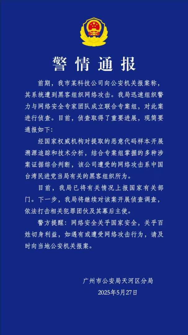 5月20日,广州市公安局天河区分局发布警情通报称,广州某科技公司遭到中国台湾民进党当局豢养的境外黑客组织网络攻击。公安机关迅速介入,提取相关攻击程序样本,固定涉案证据,并组建专业团队进行技术溯源。