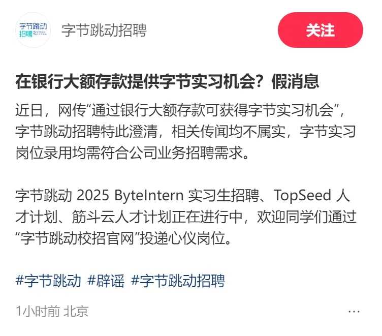 近日,网络上流传着通过银行大额存款可获得字节跳动实习机会的说法。字节跳动招聘官方账号澄清,相关传闻不属实,实习岗位录用均需符合公司业务招聘需求。提醒求职者应通过正规渠道申请实习岗位。
