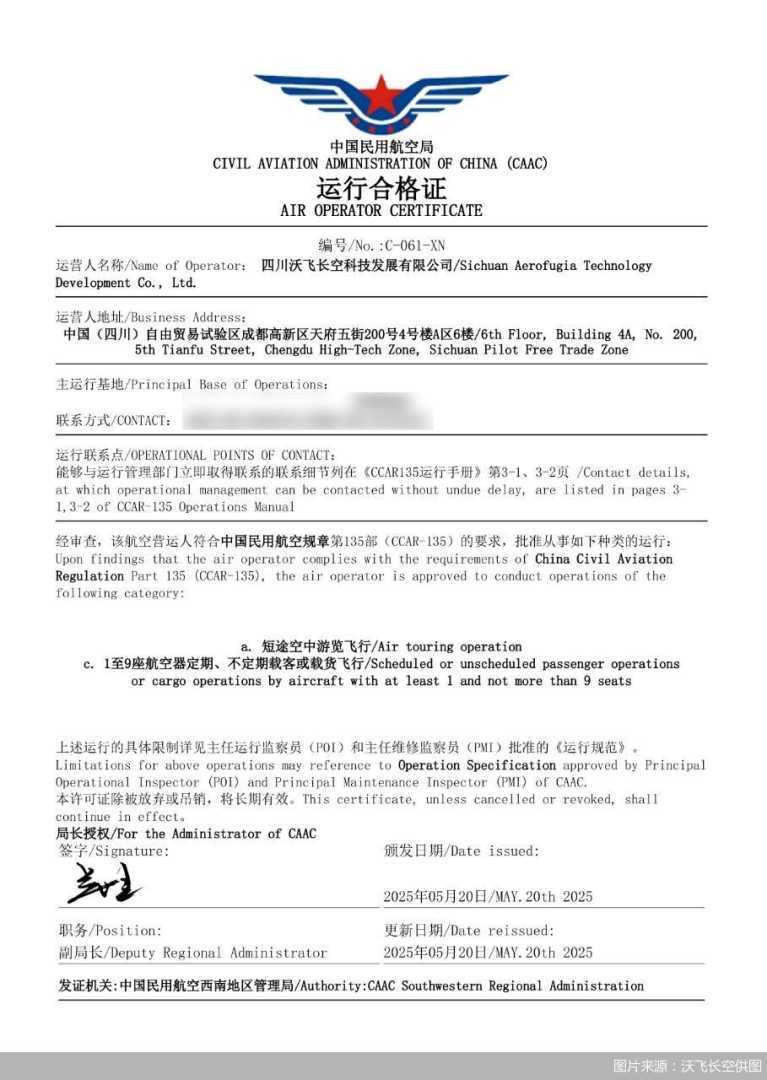 沃飞长空获CCAR—135部运行合格证,引领低空经济新突破