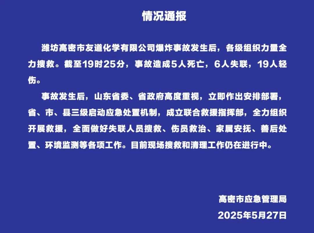 山东高密市应急管理局发布情况通报:5月27日11时57分左右,山东高密友道化学有限公司一车间发生严重爆炸事故。事故发生后,各级组织迅速响应,全力开展搜救工作。截至19时25分,该事故已造成5人死亡,6人失联,另有19人受轻伤。此次事故引起了广泛关注。