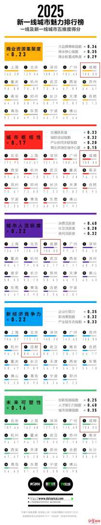 5个维度排名全面衡量城市魅力。榜单的指标体系包含商业资源集聚度、城市枢纽性、城市人活跃度、新经济竞争力和未来可塑性五大维度。成都获4个100分,在商业资源聚集度、城市枢纽性、城市人活跃度、未来可塑性上均获满分,展现其强大的综合实力。