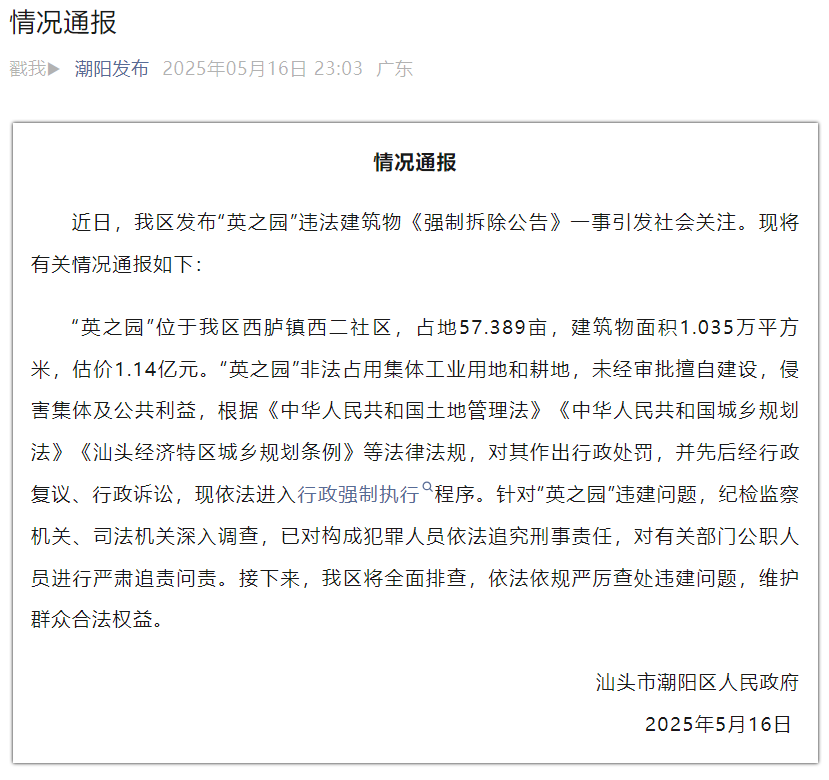 5月28日,广东省汕头市潮阳区人民政府发布通报,依法拆除位于西胪镇西二社区的“英之园”违法建筑物。该建筑占地57.389亩,建筑物面积1.035万平方米,估价高达1.14亿元。