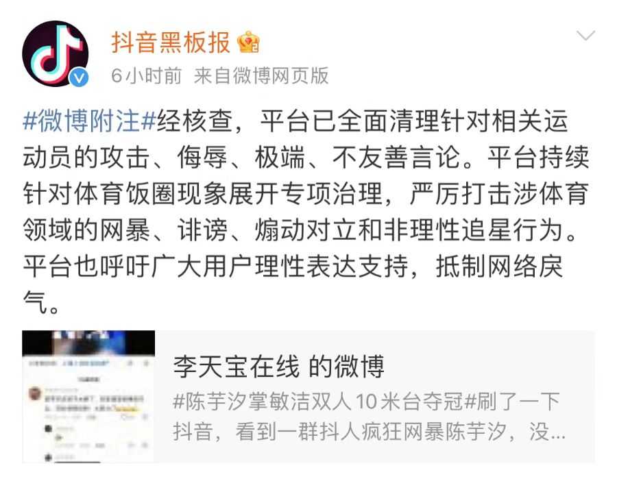 5月28日,抖音黑板报微博账号正式回应网友举报,针对陈芋汐遭遇的网络暴力事件进行全面清理。平台已删除所有针对该运动员的攻击、侮辱、极端及不友善言论,并持续针对体育饭圈现象展开专项治理,严厉打击涉体育领域的网暴、诽谤、煽动对立和非理性追星行为。抖音呼吁广大用户理性表达支持,共同抵制网络戾气。