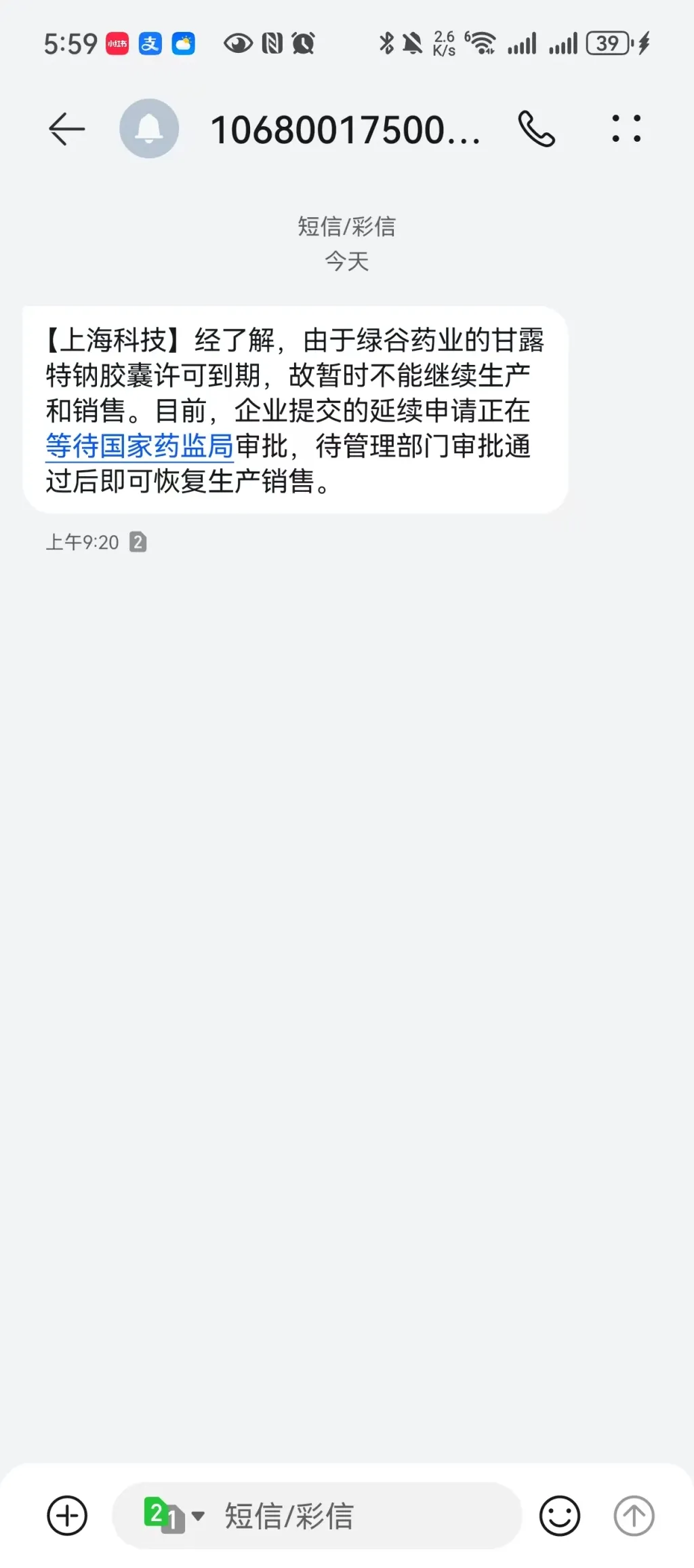 吴小姐称,她已向12345平台反馈药物短缺情况,并收到回复称,由于绿谷药业的甘露特钠胶囊许可到期,暂时不能继续生产和销售。目前企业已提交延续申请,等待国家药监局审批。