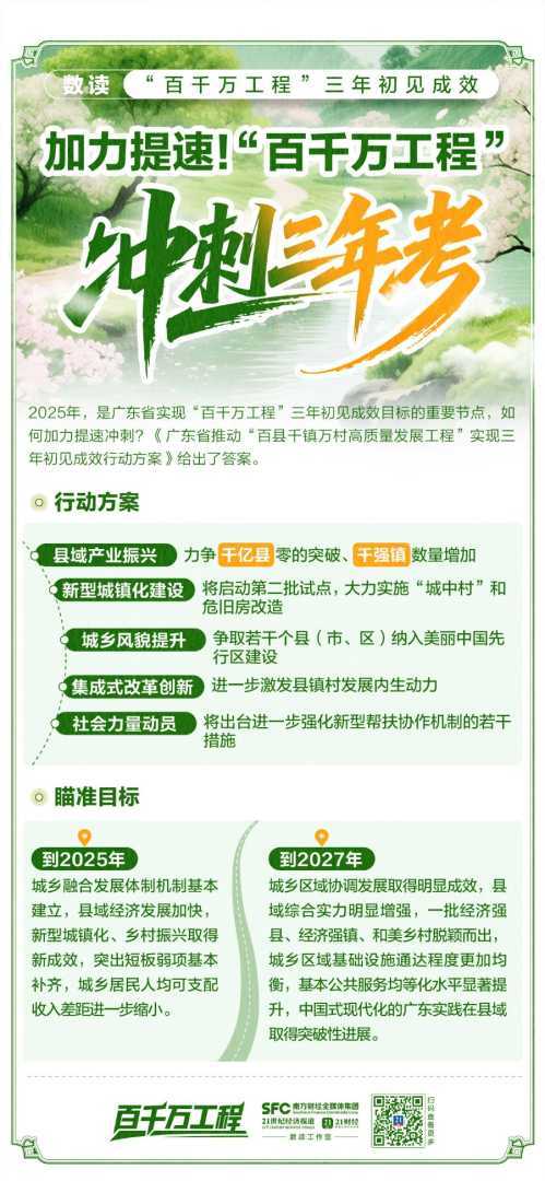 广东正积极探寻城乡区域协调发展的新策略,经过三年的不懈努力,从县域振兴到镇村的华丽蜕变,“百千万工程”已初露锋芒,展现出巨大的发展潜力。成效如何?未来规划如何?以下图表快速概览: