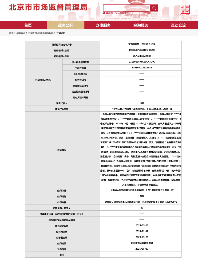 违法事实表明,该公司作为某汽车品牌授权经销商,在2024年12月27日至2025年2月20日期间,通过3个平台账号进行直播宣传,并涉及“京牌指标”的违法内容。期间共有107场直播包含相关内容,介绍京牌指标的方式大致相同。