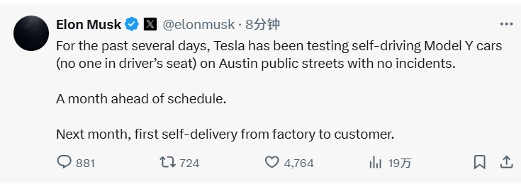 5月29日,马斯克在X上发帖称,近来,特斯拉一直在奥斯汀的公共道路上测试MODEL Y的自动驾驶系统,该系统表现卓越,未发生任何事故。更令人振奋的是,下个月(6月),特斯拉将首次通过自主交付(SELF-DELIVERY)方式,将MODEL Y自动驾驶汽车交到客户手中,这是特斯拉规模化应用自动驾驶技术的重要里程碑。
